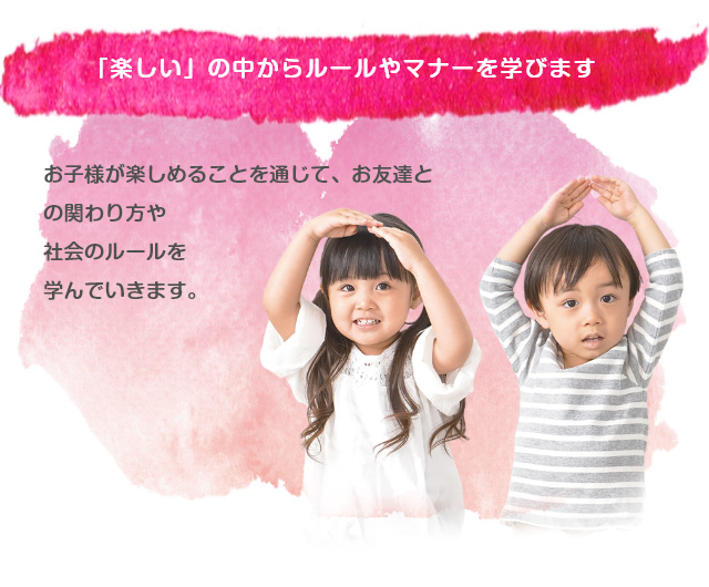 ホエール学園では「たのしい」の中から、ひとりでできるを増やし発育を助け、お友達との関わり方や社会のルールを学びます。個別や集団での支援を行うことで楽しく遊びながら表現力や協調性・コミュニケーション能力などを向上するトレーニングを行っています。また、小学生へ向けた支援としてルールやひらがなの読み方、数の数え方などの勉強にも取り組んでいきます。